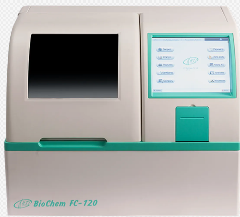 Biochem FC-120 - Компактный настольный автоматический биохимический анализатор на 100 фотометрических тестов в час со встроенным компьютером и свободно формируемым ротором проб и реагентов. Подойдет как основной анализатор для лаборатории с небольшим потоком проб или для экспресс лаборатории, а также как дублирующий анализатор в крупной лаборатории.